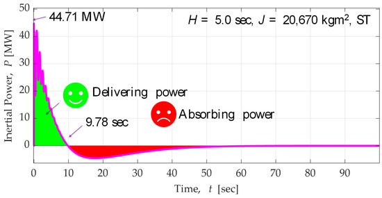 A very important aspect to discuss in relation to the inertial response of a synchronous machine is the implications related to the active power directionality and the energy involved in the process. As stated, before the synchronous generator will release energy as the frequency change, during that part of the process, the generator delivers extra active power, also known as inertial power. Figure 11 shows the inertial response of the 255 MVA synchronous generator (H = 5.0 s); the instantaneous inertial power reaches 44.71 MW immediately after the under frequency started. As depicted in Figure 11, the inertial power is positive until 9.78 s after the disturbance indicating the generator is producing extra power (pre-contingency unloaded generator) and delivering energy to the large power system; the energy contribution is highlighted in bright green colour in the figure. However, after 9.78 s, the inertial power becomes negative and reaching −4.53 MW at 16.99 s; this situation represents the synchronous regenerator draining power from the large power system, and the total energy taken from the large power system is depicted in red colour.