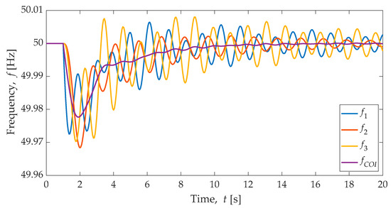 Observing the frequency response of the 3-area system, the nadir or minimum frequency occur at different times; specifically, the frequency response shows how Area 2 and Area 3 oscillate together as a group but against Area 1. The frequency of centre of inertia (fCoI) is used as a global indicator of the system frequency; during steady-state, all the synchronous machines rotate at the same speed (synchronous speed, ideally), and the frequency of the centre of inertia is equal to the frequency of each synchronous machine directly connected to the grid.