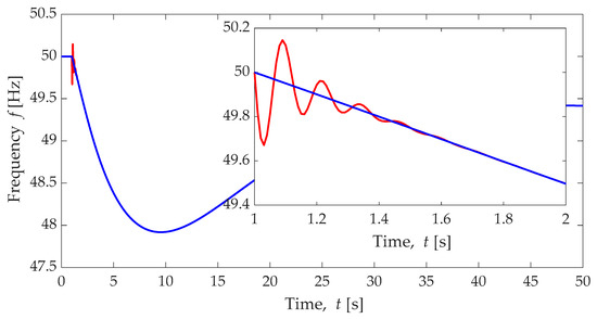 Frequency response (f in Hertz) in a single area power system considering high sampling frequency measurement where the high-speed oscillation of the frequency response is capture (red colour) and relatively low sampling frequency (blue colour).