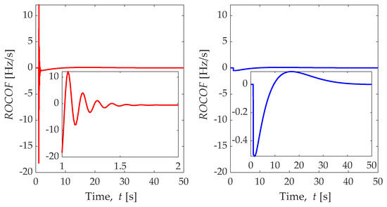 Considering the two sampled frequencies shown in Figure 15, the RoCoF is calculated by using one-step incremental difference, as shown in Equation (6), and results are shown in Figure 16. Using the high sampling discrete frequency provides a higher instantaneous RoCoF (~−18 Hz/s, left-hand plot in Figure 16) and highly oscillating RoCoF compared with the low sampling frequency (~−0.5 Hz/s).