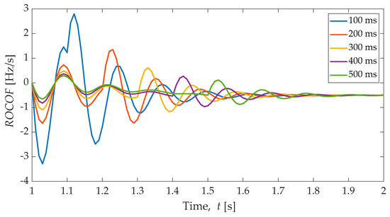 The frequency response (f in Hertz) of a single area power system, considering high sampling frequency measurement (red colour in Figure 15), has been used to calculate the RoCoF, considering several windows size (from 100 ms to 500 ms), results are shown in Figure 17. Large windows size tends to filter high-speed oscillations and displace the time of the maximum instantaneous RoCoF.