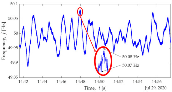 The experiment starts by collecting time series of frequency from a measurement device. The laboratory of Prof Gonzalez-Longatt (see https://fglongattlab.fglongatt.org/index.html for more information, accessed on 6 September 2021) has a phasor measurement unit (PMU) ArbiterTM Systems [38] 1133A Power SentinelTM.The time-series of electrical frequency of the Nordic Power System was recorded using the ArbiterTM Systems [38] 1133A Power SentinelTM installed at Porsgrunn Norway (Lat 59°8′17.64″ N, Long 9°40′17.99″ E) and the time series is depicted in Figure 18.