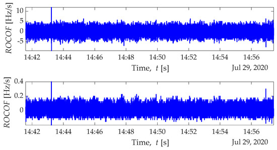 Time series of the moving window-based calculation of the RoCoF, (top) moving window size of 0.04 s and (bottom) 500 ms.