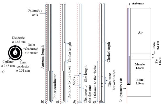 These are the most common type of microwave antennas, especially because of the easiness of their construction. In this case, the inner and the outer conductor (See Figure 1a) are soldered at the distal tip of the antenna. A small slot (less than one-tenth) of the effective wavelength is cut around the outer conductor near the solder point to allow propagation of the electromagnetic wave in the tissues [45]. The slots must be located near to the short-circuit at the distal tip to allow the wave propagation through the tissue. The slots are air grooves that allow a major concentration of heat near their location, i.e., they work as a guide to the electromagnetic radiation. The choke has the same goal as previously described. Figure 1d,e shows the geometrical design of both antennas.