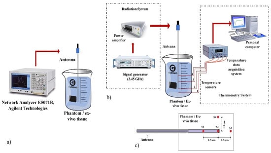 Experimental set-up to evaluate the antenna performance. (a) Experimental setup to measure the SWR of the antennas inserted in the multilayer phantom and the ex vivo porcine tissue, (b) Radiation and thermometry system used in the experimental tests, (c) Temperature sensors location (S1, S2, S3, and S4) to measure the temperature generated for the antennas.