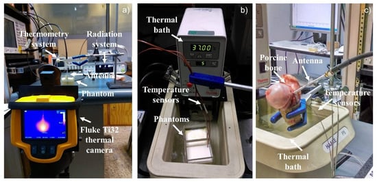 To evaluate the efficiency of the four antennas, different experimental tests were implemented in multilayer phantoms. The experiments were done by applying an input power of 5 W and 10 W per 5 min. In order to emulate the physiological temperature, the multilayer phantoms were heated up to 37 °C by using a thermal bath. Once the 37 °C were reached in the phantoms, the antenna and the sensors were placed inside it. The antennas were covered with a Teflon™ layer; this layer allows the tissue or phantom, which are in direct contact with the antenna, not to be adhered to the antenna body. Figure 3a,b show the experimental test with a phantom inside the thermal bath as well as the antenna, with the Teflon™ layer, connected to the radiation system.
