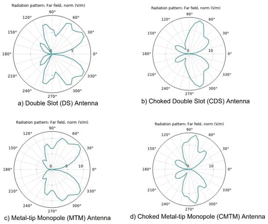 Directivity diagrams for the designed antennas. (a) Double Slot antenna, (b) Chocked Double Slot antenna, (c) Metal-Tip Monopole antenna, (d) Chocked Double Slot antenna, obtained by using COMSOL-Multiphysics.