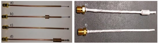 Four micro-coaxial antennas were included in this study to analyze the feasibility of their use to treat bone tissue. Previously, some micro-coaxial antennas were designed, constructed, and tested [29]. Although these antennas had a correct performance to treat bone tissue, we found out that their diameters were not the correct ones, i.e., the antennas were so thin (diameter of 1.2 mm) that they easily lost their shape during the experimental process. Therefore, new double slot, double slot with choke, metal—tip monopole, and metal—tip monopole with choke antennas were proposed.