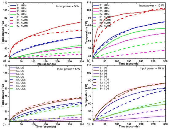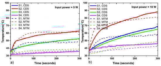 The temperature profiles generated by the MTM antenna after 100 s of radiation showed a constant temperature increase; while the ones generated by the CDS antenna increase during all the experiments. The experiments with 10 W (Figure 9b) showed that both antennas exceed 80 °C in sensor S2. For the CDS antenna, in sensors S1, S2, and S3, temperatures above 60 °C were reached after 200 s of radiation. The CDS antenna generates the highest temperature (87 °C) of both antennas. The temperature difference between the MTM and CDS antenna at the antenna tip was 6 °C. In addition, the sensor S3, which was located under the antenna tip, reached a higher temperature for the CDS antenna than for the MTM antenna. The temperature difference at sensor S3 was approximately 10 °C and 18 °C for 5 W and 10 W of input power, respectively. In this case, the choke in the CDS antenna generates a greater energy deposition under the choke, thereby generating a greater increase in temperature.