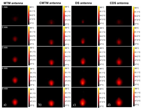 The thermal distributions generated by the MTM antennas were focused on the antenna tip (Figure 7a,b); while the thermal distributions generated by the DS antennas start to be spread around the slots (Figure 7c,d), which causes a thermal distribution longer than the one generated by the MTM antennas. The energy focusing on the antenna tip was due to the greatest microwave propagation occurring at the antenna body where the outer conductor was removed to create the monopole and the antenna slots. For the DS antennas, the outer conductor of the antenna was removed to create the slots, whereas in the MTM antennas, the outer conductor was removed to create the monopole.