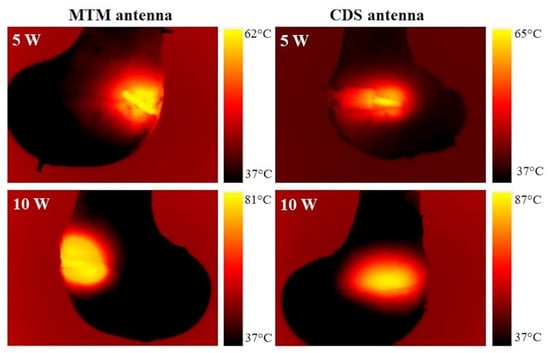 Figure 8 shows the thermal distributions generated by the antennas with an input power of 5 W and 10 W after 5 min of radiation. The thermal distribution generated by the MTM antenna had the same spherical shape in both cases (5 W and 10 W); therefore, the difference was observed in the reached temperatures. The CDS antenna had an elongated thermal distribution. In the thermal distribution generated by the CDS antenna with 5 W, it was observed that the thermal distribution is more concentrated just next to the start of the choke, resulting in less damage to healthy tissue. The thermal distribution generated by the MTM antenna was similar to a semicircle; in this case, it was not like a complete circle as the one obtained in phantom experimentation (See Figure 7a). This was because in the phantom experiments the monopole was entirely inside the tissue; while, in the ex vivo tissue experiments, the monopole was not totally inside the bone, so the thermal distribution was affected by the insertion depth of the antenna. On the other hand, in the CDS antenna, a complete thermal distribution is observed because both the choke and the slots were inside the bone tissue.