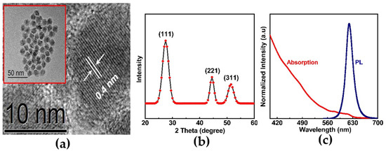 Characteristics of CdSe/ZnS core–shell QDs; (a) HRTEM and TEM images; (b) XRD pattern; and (c) UV−vis absorption and PL spectra.