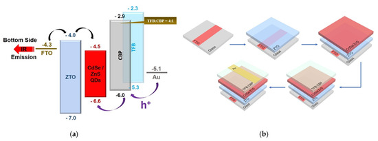 (a) Energy-level diagram of QD-based LED; (b) Schematic presentation of the fabrication of QD-LED.
