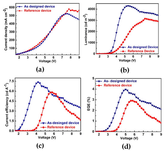 Comparisons results; (a) current density vs. voltage (V); (b) luminance vs. V; (c) current efficiency vs. V; (d) external quantum efficiency vs. V.
