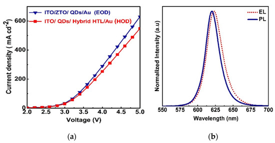 (a) HODs and EODs comparisons; (b) comparison of the EL spectrum of an as-designed device with the PL spectrum of the QDs in film state.