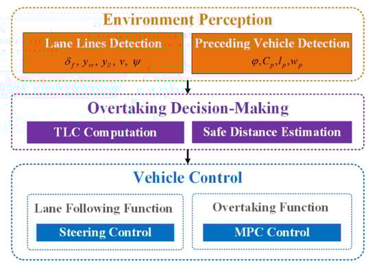 The proposed autonomous overtaking system is composed of three functional modules: perception, overtaking decision making, and vehicle control. The architecture of the proposed autonomous overtaking system is shown in