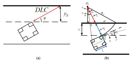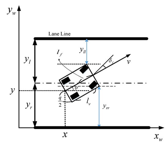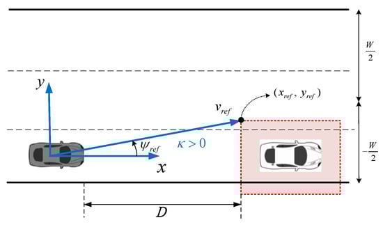 are the lateral distances from the vehicle’s center of gravity (CG) to the left and right boundaries of the lanes, respectively. One can estimate the distance to lane crossing (DLC) using Equation (2), and then, the time to lane crossing (TLC) can be derived to correct the steering so that the vehicle stays entirely within a marked lane. Overtaking control is executed using the kinematic vehicle model and the model predictive control strategy to estimate the suitable steering angle and acceleration commands for the host vehicle that calls the autonomous overtaking function.