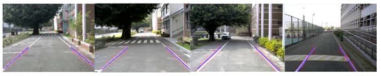 The experimental environment is a 3.7 m wide and 80 m long single lane with a T-junction. The vehicle velocity is restricted to 7.2 km/h. The lane line detection results are shown in