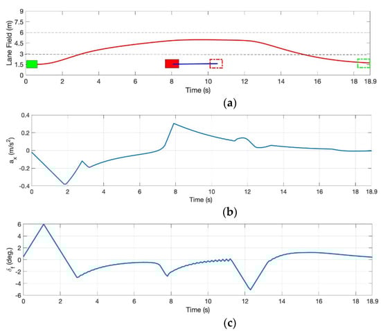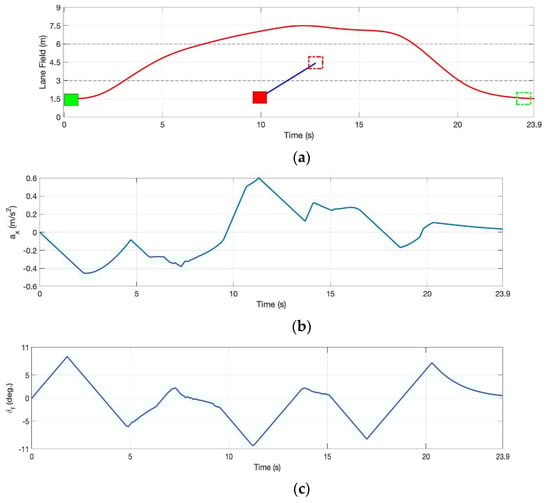In this case, the approaching vehicle moves forward with a lateral velocity (0.36 km/h). The experimental results of the overtaking trajectory of the ego vehicle and its status are shown in