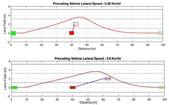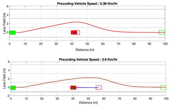 Next, we simulated the faster test scenarios using MATLAB, where the speed of the ego vehicle is increased to 18 km/h and where two different speeds of the approaching vehicle (0.36 and 3.6) are considered. The simulation results are presented as follows.