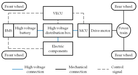 The configuration of EV is shown in Figure 1. The whole vehicle power unit adopts permanent magnet synchronous motor which is controlled by motor control unit (MCU) and transmits the power to the rear wheels through power train [21]. The whole vehicle energy device adopts lithium iron phosphate battery which is controlled by a battery management system (BMS) and provides electric power for the motor and electric components through the high voltage distribution box [22]. The vehicle electronic control unit (VECU) receives control instructions from the accelerator and brake pedals, gives the correct control signal to the high voltage distribution box to control the direction of power flow, and also controls the regenerative braking and electronic accessories together with the energy management system [23]. The detailed parameters of the studied vehicle are shown in Table 1.