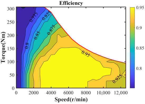 The EV studied in this paper is driven by a permanent magnet synchronous motor, whose efficiency map at rated power is shown in Figure 2. The output torque and efficiency of the motor are described in Equations (2) and (3), respectively.