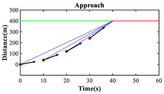 The more effective way to design the passing speed is to discretize the passing process and constrain the speed at each moment. By making multiple comparisons at discrete moments, the vehicle acceleration is adjusted so that the vehicle can pass through the intersection within the green light. An example diagram for replacing the dynamic adjustment process with a discrete method is shown in Figure 4. The horizontal line represents a traffic light 400 m away from the starting position. The color of the horizontal line represents the color of the traffic light that changes with time. The red dots represent the position of the vehicle at different moments. The slope of the black arrow represents the speed of the vehicle at the current position. The blue line is the average speed required to ensure that the vehicle passes before the end of the green light. In Figure 4, at the initial moment, the vehicle speed is slow and the black arrow is below the blue line. If the vehicle continues to drive at its current speed, it will not be able to pass the interaction before the end of the current green light. The vehicle begins to accelerate gradually until the black arrow coincides with the blue line at 30 s. The vehicle will be able to cross the intersection before the end of the green light by maintaining this speed. In the example only the velocity magnitudes of four moments are given. During the time other than these four moments, the vehicle travel process can be an arbitrary and reasonably complex acceleration and deceleration state. This allows arbitrary dynamic processes to be implemented with speed constraints at discrete moments. The method simplifies the complexity of modeling and also provides a larger optimization search space for subsequent energy management optimization.