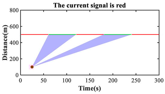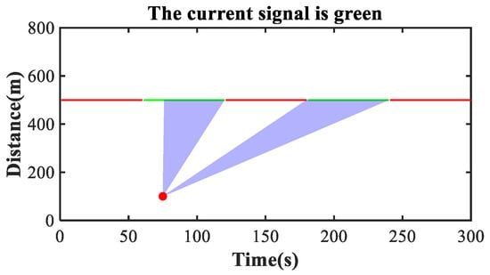 The second category of situation is shown in Figure 6. It is necessary to consider whether the vehicle has time to pass during the current green light period. If it is not in time, then the speed constraint of the subsequent green light needs to be considered. The minimum value of the speed constraint and are calculated as described in Equations (10) and (11) above. The maximum value of the speed constraint in the second category of situation is described in the following equation: