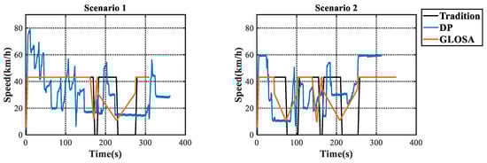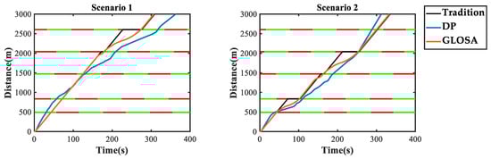 Figure 7 shows the trend of vehicle speed with time in Scenarios 1 and 2 for all strategies. Figure 8 shows the time–space domain trajectories in Scenarios 1 and 2 for all strategies.