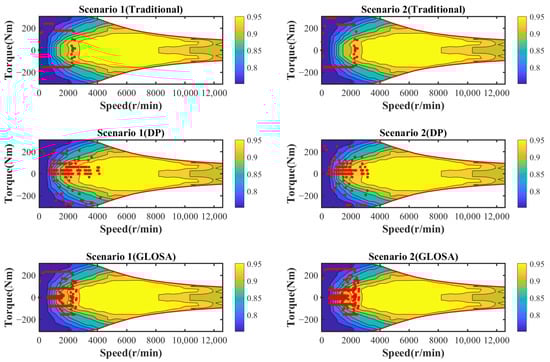 For each strategy, there is a large similarity in the location of the motor operating point distribution for the different scenarios. Since the traditional strategy has a fixed speed after vehicle starting, the distribution of operating points shows a clear border and does not reach more efficient area. The motor tends to achieve lower efficiency at a lower rotation speed. Therefore, the stopping and starting of the vehicle leads to the frequent switching of operating points between the inefficient and efficient areas. For DP, there is a tendency for operating points to be distributed around the contour and a larger number of operating points reach more efficient area. Compared with the traditional strategy, DP does not put the vehicle through a stop, and therefore achieves higher energy utilization efficiency. The distribution of the operating points of GLOSA is more concentrated overall. Still, none of the points reach the most efficient area.