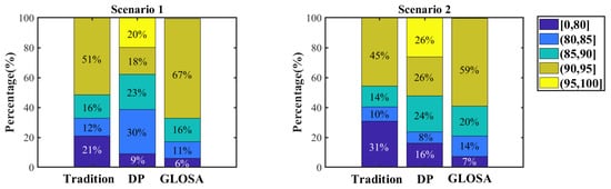 Combining the analysis with Figure 10, for Scenario 1, the traditional solution does not have operating points within the efficiency of 95−100%. Instead, there are more operating points in the low efficiency area of 0–80% due to the presence of vehicle start–stop processes. Because of the simple acceleration process, there are fewer operating points that stay to 80–90%. For DP, since no vehicle start–stop process occurs, there are few operating points in the low efficiency area from 0−80%—only 9%. Additionally, 20% of the operating points have an efficiency of 95% or more. In Scenario 2, the same conclusion can be obtained. Scenario 1 is compared with Scenario 2 below. For the traditional strategy, the increase in the number of stops makes the operating point distribution of Scenario 2 worse. For DP, there are fewer operating points within the efficiency of 0–80% in scenario 1 and more operating points within the efficiency of 90–100% in Scenario 2. However, in Scenario 2 there are more operating points distributed in the 95–100% interval. In both scenarios, GLOSA performs similarly to the traditional strategy in the efficiency area of 80–90%. GLOSA outperforms the traditional strategy in both the 0−80% efficiency area and the 90–95% efficiency area.