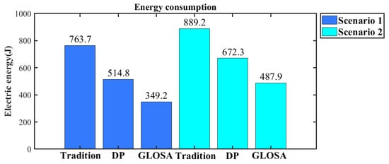 The above analysis discusses only the number of operating points in each interval. In the following, the generated energy consumption will be analyzed in conjunction with Figure 11. In Scenario 1, the DP saves 54.27% of energy consumption compared with the traditional strategy and 32.17% of energy consumption compared with GLOSA. In Scenario 2, DP saves 45.13% and 27.43%. This shows that the signalized intersection passage process has a high energy saving potential. Comparing the different scenarios, the energy consumption of Scenario 1 will always be lower than that of Scenario 2 when the strategies are the same. This indicates that the initial phase of traffic lights in Scenario 1 is set more reasonably for the road.