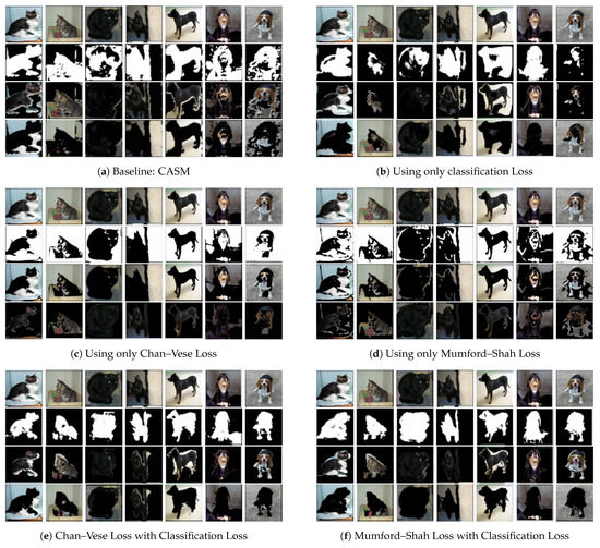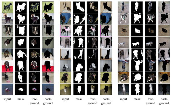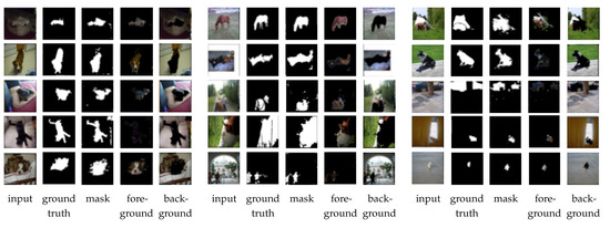 Figure 4 shows the results of these three experiments and our main two experiments’ (Figure 1 and Figure 2) results. For the baseline, we use the results of CASM [23] that segments the image to the foreground and the background, because we use the same network structure as CASM. For each set of result images, the first row is the input image, the second row is the generated mask, the third row is the foreground image (i.e., ), and the last row is the background image (i.e., ). When we observe Figure 4b, it is remarkable that when we use our classification loss (12) and a regularization term for segmentation (i.e., using Figure 1 except the Chan–Vese loss to classify the as the foreground and classify the as the background), we can get the area of the foreground. However, we cannot detect the whole area of the object. With Figure 4c,d, applying the Chan–Vese loss (7) and the Mumford–Shah loss (10) without classification loss (12) to the our simple auto-encoder can achieve a precise boundary of the object. However, the inside of the mask is not homogeneous. This is because (7) and (10) are minimized when pixels of similar intensity of the image are grouped together. Furthermore, the mask cannot detect the object as the foreground, since (7) and (10) are the functions of the intensity of the pixels. To make each region detected by the mask have the meaning of the foreground or the background, we concatenate the Chan–Vese loss (7) and the Mumford–Shah loss (10) with the classification loss (12) to make our total loss (6). The results of our total loss are in Figure 4e,f. The result of total loss combining Chan–Vese loss and classification loss is Figure 4e, and the result of total loss combining Mumford-Shan loss and classification loss is Figure 4e. Comparing the results of Figure 4c,d with those of Figure 4e,f shows that the area that was detected as black by the mask changed to the white area. This means that the mask finally detects the object as the foreground. Furthermore, when we compare with the baseline Figure 4a, we can get a more precise boundary since the Chan–Vese loss or the Mumford–Shah loss is used in addition to the classification loss as the segmentation loss. Figure 5 and Figure 6 show more segmentation results when using our total loss (6). Figure 5 is the result with the [9] dataset and uses our total loss (6), where the is composed of the Mumford–Shah functional. In Figure 5, the first column is the input images, the second column is the generated masks (i.e., ) by our total loss (6), the third column is the foreground images (i.e., ), and the last column is the background images (i.e., ). We can see that the masks detect the dogs and cats very accurately, and the boundaries resemble the shape of the dogs and cats. Furthermore, there are no parts of the dogs and cats in the background images. In Figure 6, we additionally add the ground-truth masks in the second column. When we compare the ground-truth mask (second column) and the generated mask by our total loss (6), we could get masks of very similar shape to the ground-truth masks even if the objects classified as foreground are small. However, when we use the PASCAL VOC dataset, we assume that the one image has only one image-level label, although there are multiple objects since our mask segments the image as the foreground and the background.