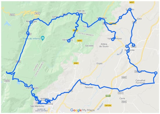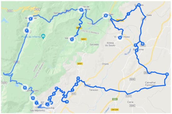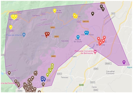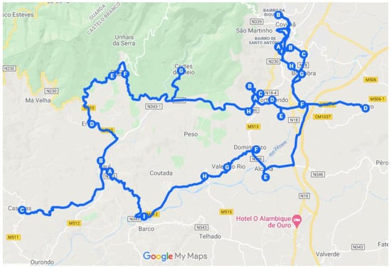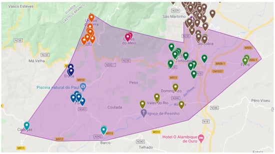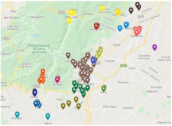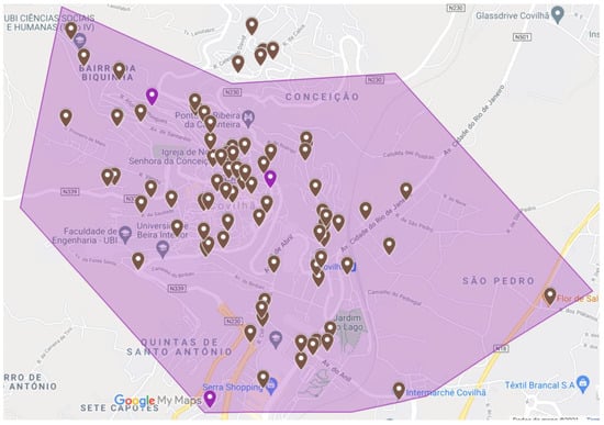 The problem under analysis is the creation of a decision support system (DSS) that allows for the optimization of distribution routes of a small food and beverage distribution company, headquartered in Covilhã, Portugal. The main goal of the DSS is to optimize routes, for the five days of the week, which minimizes travel costs and the distances traveled by workers, considering the approximately 270 establishments provided by the company. These locations can be seen in Figure 2.