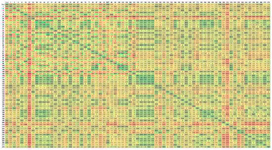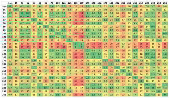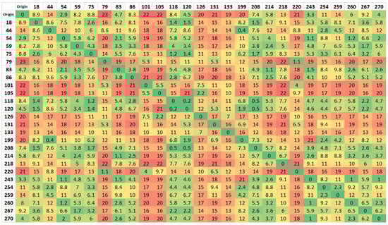 Thus, taking into account the proximity of all points, there was no need to optimize the routes, so the 72 × 72 matrix was considered (Figure 8). As can be seen in Table 5, the distances of the routes within this zone have much smaller values than the other zones.