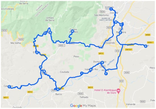 Based on methods already developed, such as VRP, TSP, m-TSP, combined with Genetic Algorithms (GA), it was possible to obtain the best route to follow in order to minimize costs []. A GA is a meta-heuristic method that does not work with single optimal solutions, but with populations of solutions [].
