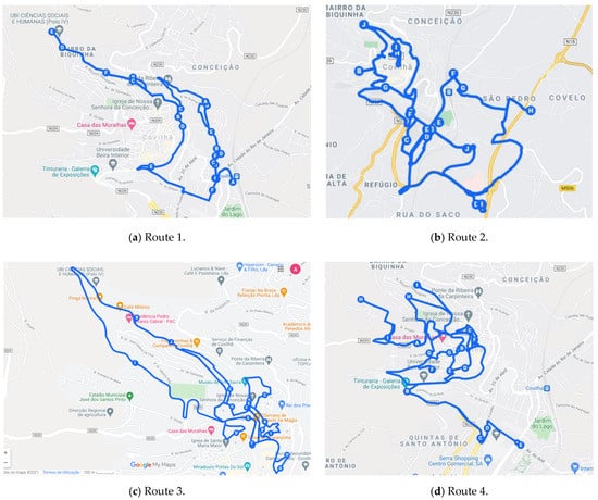 For the Central zone of the city, four routes were generated: two for each worker, representing the two days of the week that will be assigned in this zone. These routes are shown in Figure 15a–d.