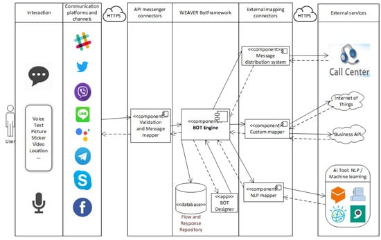 The logical architecture of the proposed solution, called Weaver, is based on the reference chatbot model proposed by the authors E. Adamopoulou and L. Moussiades [33]. This architecture can be used for developing a broad range of chatbots. It enables the understanding, implementation, maintenance, and further development of a platform-independent chatbot.