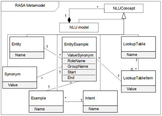 The excerpt of the RASA metamodel with the most abstract RASA NLU concept is shown in Figure 5. It is specialized using more concrete NLU concepts: