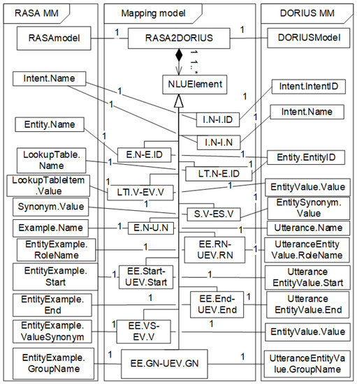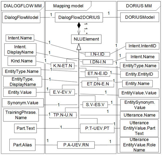 The Mapping metamodel, shown in Figure 6, defines allowed correspondences between Dialogflow NLU concepts and DORIUS NLU concepts based on the rules. A mapping between two concrete Dialogflow and DORIUS models is represented by Dialogflow2DORIUS class, which encompasses all correspondences between concrete elements of the Dialogflow and DORIUS models made using the mapping rules. The class NLUElement represents an instance of such correspondences. For each mapping rule, there are appropriate subclasses of NLUElement, which are named after the rule. As is obvious from the metamodel, mappings between concepts of Dialogflow model and DORIUS model are unique and non-ambiguous.