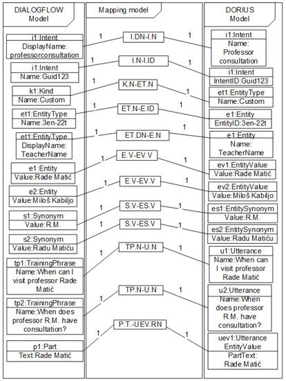 A part of the corresponding mapping model between the Dialogflow model and the DORIUS model is given in the object diagram in Figure 8. The Dialogflow model package contains instances of the Dialogflow metamodel from Figure 4, while the package DORIUS model contains instances of the DORIUS metamodel from Figure 3. The Package Mapping model contains instances of the corresponding mapping rules by which concepts of the Dialogflow are mapped from the concept of the DORIUS. For example, intent i1 (ProfessorConsultation) is mapped from corresponding intent of the same name using the I.DN-I.N rule. Kind k1 is mapped from et1:EntityType of the same name using the K.N-ET.N rule. On the other hand, attribute Name (3en-22t) of et1:EntityType, is mapped from attribute EntityID (3en-22t) of e1:Entity by rule ET.N-E.ID. Furthermore, attribute DisplayName (TeacherName) of et1:EntityType, is mapped from attribute Name (TeacherName) of e1:Entity by rule ET.DN-E.N. Thus, entities e1 (Rade Matić) and e2 (Miloš Kabiljo) are mapped from corresponding entity values ev1 and ev2 of the same value using the E.V-E.VV rule. Furthermore, synonyms s1 (R.M.) and s2 (Radu Matiću) are mapped to corresponding entity synonyms es1 and es2 of the same value using the S.V-E.SV rule. Training phrases tp1 and tp2 are mapped from corresponding utterances u1 and u2 of the same name using the TP.N-U.N rule. Attribute Text of p1:Part is mapped from attribute PartText of uev1:UtteranceEntityValue by rule P.T-UEV.RN. UtteranceEntityValue represents entity value in one or more utterances. For example, in the utterance: “When does Professor Rade Matić have a consultation?”, entity value Rade Matić is PartText. An example of a mapping model with only one NLU metamodel is given here. A similar example of mapping can be shown for the RASA metamodel, but due to work limitations, the details of mapping are not part of this work.