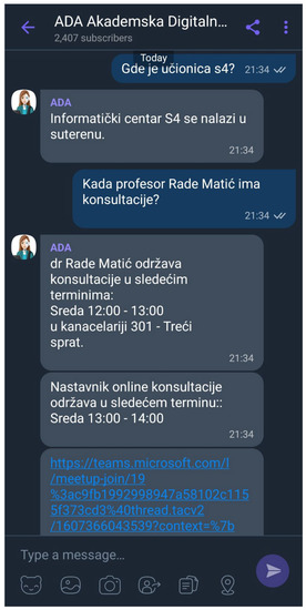 - ADA Chatbot. Available online: https://chatbot.bpa.edu.rs/en/index.html (accessed on 5 July 2021).