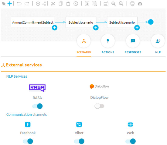 External mapping connectors serve for connection with external services, such as NLU services. These connectors also have separate predefined mapping rules for each specific type and implementation. In addition to predefined connectors working with the above-mentioned services, there are also custom connectors for external data necessary in conversation, in which mappings can be changed depending on the need to successfully realize any conversation. External mapping connectors also contain components that expose services to other systems participating in the communication process with the user, e.g., a contact center that could take over user conversation. The BotFramework can be integrated with the existing contact center application with the help of the component Message Distribution Connector. In the case of complex questions, the user is redirected and chats with the operator from the corresponding contact center. The extensibility of the proposed framework simplifies the integration of other useful external services. The BotDesigner is a visual tool equipped with the Software Development Kit (SDK) for the corresponding implementation platform. The SDK offers possibilities that facilitate chatbot–user interactions. Using SDK, it is possible to directly teach the NLU to avoid dependency on the NLU interface of the vendor. In addition, BotDesigner enables the visual generation of the scenario, i.e., its flow. The flow of conversation maps all potential directions in which the discussion may develop, with many branches for all possibilities. The conversation flow is responsible for predicting all possible input messages and chatbot reactions. This helps users to quickly achieve their goals and to obtain information easier and give priority to business needs. The BotDesigner is intuitive and easy to understand and use. All data necessary for scenario flow management and context-based responses, identified intents, and entities are in the Flow and Response Repository. This database is used for storing all predefined scenarios with their actions and conditions, responses with the necessary segmentation, conversations, users, and logs. It accommodates all settings related to connectors, components, and general system settings. All metamodels and mapping rules are also stored in this database.