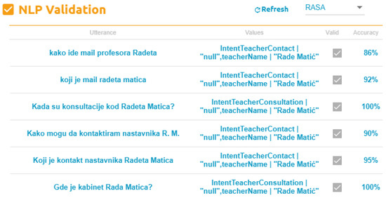 Because the Serbian language is very difficult, a very large training set with various utterances was needed for the model to be as efficient as possible. In addition to utterances, we take care of the entities, their values, as well as their synonyms due to the complexity of the Serbian language, which can be a problem during the recognition of intent. ADA, unlike COVID-19, has a lot of entities that have the same value but different meanings. In that case, we use the concept of entity role so that the same entity in a sentence can have two meanings. An example of this entity is “management”, which can be the name of subject in one study program and the name of another study program. Table 3 presents the number of intents, utterances, entities to make ADA and COVID-19 functional in Serbian. These numbers are growing because we are constantly working on learning and improving the model.