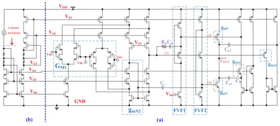 The last class-AB stage should be constructed with large transistors to supply large current. Among many existing topologies, flipped voltage follower (FVF)-based buffers are an attractive topological choice to drive the output class-AB stage. The main advantage of the FVF is the reduced output resistance due to shunt feedback connection, which is the key for obtaining fast transient response and minimal area requirements for implementing amplifiers for on-chip applications. The schematic of a PMOS version of FVF is shown in Figure 3a, which consists of PMOS input transistor , shunt feedback transistor and bias-current-source transistor.
