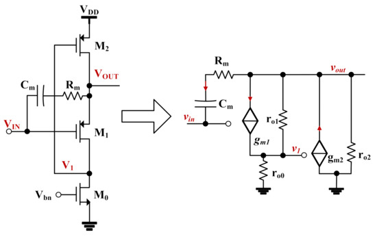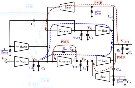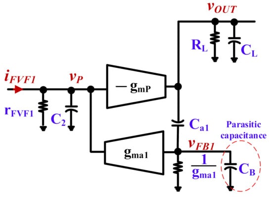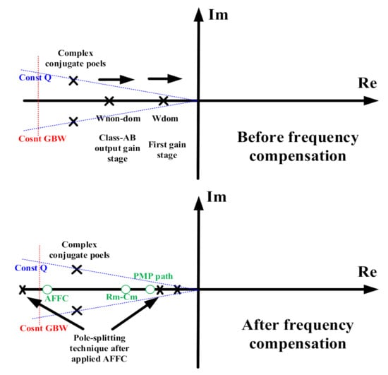 It is obvious that the and are inevitably generated, and the must be removed in order to make the frequency compensation effective, which allows the circuit only to take advantage of the effect of rather than being influenced by Therefore, the cascode compensation by AFFC is used to generate pole-splitting effect to eliminate pole .