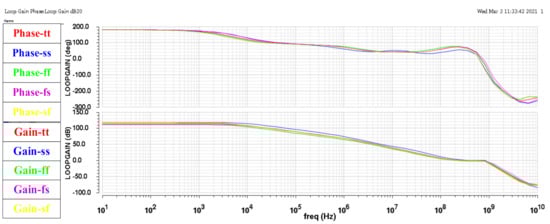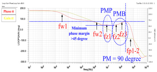 The reason for designing the -value according to Equations (20)–(22) can be understood using Figure 8, which shows that the effect of a pair of nondominant complex poles can cause different -values on the voltage gain and phase shift of a generic three-stage amplifier. To avoid gain overshooting and dramatic phase reduction, as shown in Figure 8, -value of complex poles must be ensured to be smaller than 1. Therefore, the feature of having an additional positive phase shift due to two LHP zeros creates an opportunity to achieve stability by using an advanced pole-zero placement strategy. Due to the presence of two separate LHP zeros, the positive phase shift generated by will cancel out the amount of the negative phase shift caused by the nondominant complex poles . The stability of the DLAFC amplifier is determined by its phase margin (PM) that is given as: