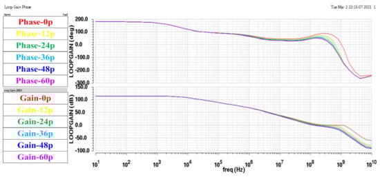 The simulated bode diagrams of the DLAFC configuration under different capacitor load between 0–60 pF.