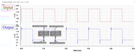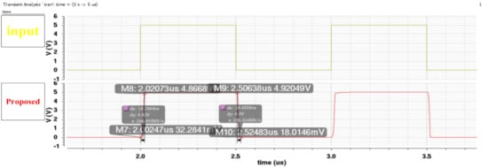 The transient simulation results of slew rate when the proposed circuit in closed-loop state is fed with a small-swing input.