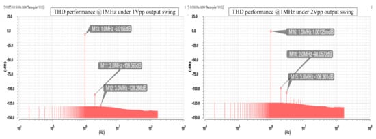 The simulation results of the total harmonic distortion of the proposed circuit under 1 V and 2 V output swing operating at 1 MHz.